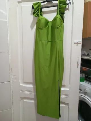Elegante vestito con un vivace colore verde. Presenta un design con spalline sottili e un dettaglio di volant sulle spalle, che aggiunge un tocco di femminilità. La lunghezza midi e lo spacco laterale lo rendono adatto per occasioni speciali. - Spalline sottili con volant. - Lunghezza midi. - Spacco laterale.