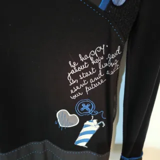 Vestito da donna con maniche lunghe e dettagli ricamati. - Scollo rotondo con bordo blu. - Patchwork di tessuti e cuciture a vista. - Applicazioni decorative come forbici, cuore, bottoni e un disegno stilizzato - chiusura con cerniera laterale