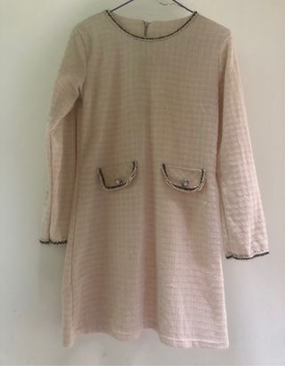 Elegante vestito stile Coco Chanel, perfetto per ogni occasione. Il tessuto bouclé dona un tocco di classe. - Scollo rotondo con bordatura decorata. - Tasche frontali con patta e dettaglio gioiello. - Maniche lunghe. - Fondo e maniche rifiniti con bordatura. - Chiusura posteriore con zip.
