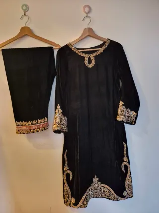 Elegante abito indiano fatto a mano in velluto nero con ricami dorati. - Dettagli ricamati sul collo e sulle maniche. - Orlo inferiore decorato con motivi elaborati. - Pantaloni abbinati con bordi ricamati.