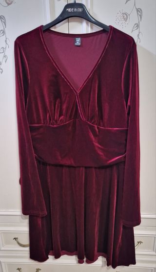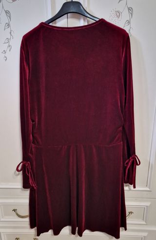 Elegante vestito da sera in velluto. Poliestere elastico Lunghezza cm 98 Da ascella ad ascella cm 50 Larghezza spalle cm 44 - Tessuto morbido e lucido. - Scollo a V. - Maniche lunghe. - Cintura elasticizzata in vita.