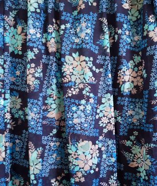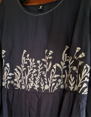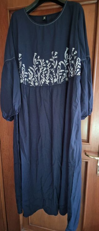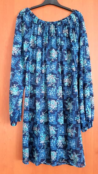 Abito da donna con una fantasia floreale nei toni del blu e dell'azzurro. Il modello presenta un taglio morbido e maniche lunghe. Poliestere, taglia M, cm 38 da spalla a spalla, cm 93 lunghezza dalla spalla - Tessuto leggero e impalpabile. - Scollo morbido con elastico. - Polsini elasticizzati.