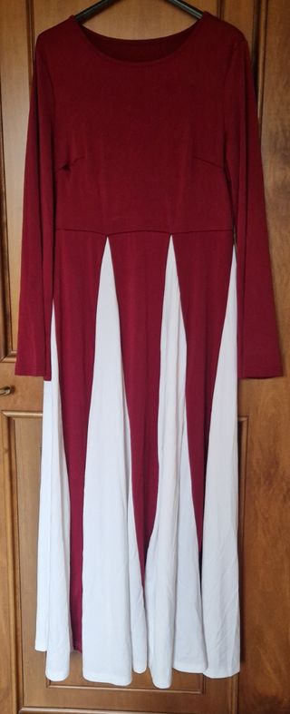 Elegante vestito lungo da donna, perfetto per occasioni speciali. 100x100 poliestere - Design bicolore con parte superiore rossa e gonna a pannelli bianchi. - Maniche lunghe. Lunghezza cm 140 da ascella ad ascella cm 50 larghezza spalle cm 44