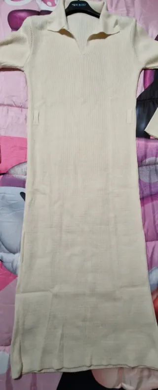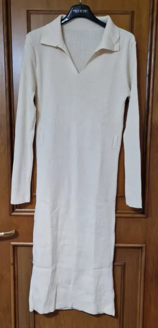 Vestito da donna con colletto bianco. Lunghezza cm 90 da ascella ad ascella cm 52 larghezza spalle cm 48 100x100 acrilico - Tessuto lavorato a maglia. - Maniche lunghe. - Lunghezza al ginocchio. Usato una volta no difetti