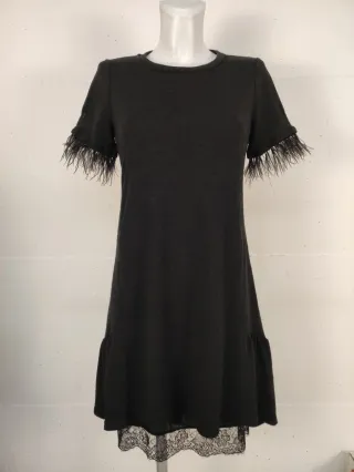 Elegante abito nero da donna, perfetto per occasioni speciali. - Taglia M in ottime condizioni. - Maniche corte con dettagli in piume. - Fondo con balza e inserto in pizzo. - Tessuto morbido e confortevole con interno foderato nero.