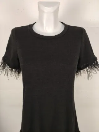 Elegante abito da sera tubino con dettagli in piume. Lunghezza cm 74 da ascella ad ascella cm 38 Cotone elastico poliestere - Tessuto a maglia. - Orlo con piume sintetiche. - Lunghezza al ginocchio.