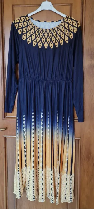 Vestito lungo da donna con fantasia. Poliestere elastico Lunghezza cm 144 da ascella ad ascella cm 50 larghezza spalle cm 46 - Scollo rotondo. - Maniche lunghe. - Elastico in vita. - Fantasia geometrica sul corpetto. - Stampa sfumata con motivi decorativi sulla gonna.