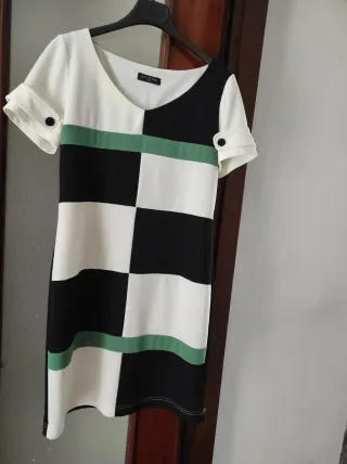 Vestito corto con un design a blocchi di colore. Larghezza spalle cm.40, lunghezza totale cm.90. - Maniche corte con dettaglio. - Scollo a V. - Inserti a contrasto.