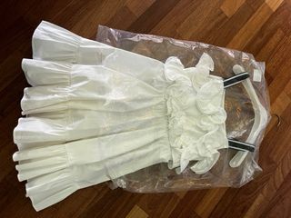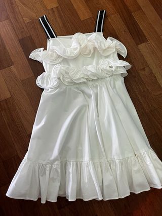 Elegante vestito Twinset mai indossato, perfetto per ogni occasione. - Colore bianco brillante con dettagli dorati. - Maniche a sbuffo con volant. - Gonna a balze. - Chiusura con zip sul retro.