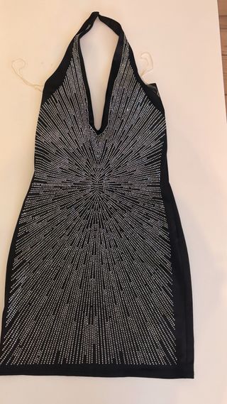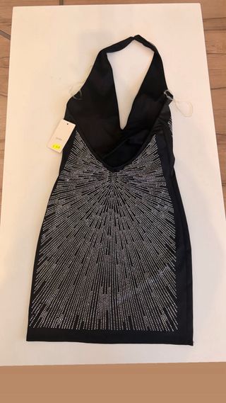Elegante abito da sera corto, perfetto per occasioni speciali. - Scollo a V profondo. - Decorato con strass scintillanti. - Design a collo alto. - Tessuto elasticizzato per una vestibilità comoda.