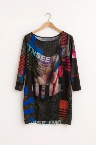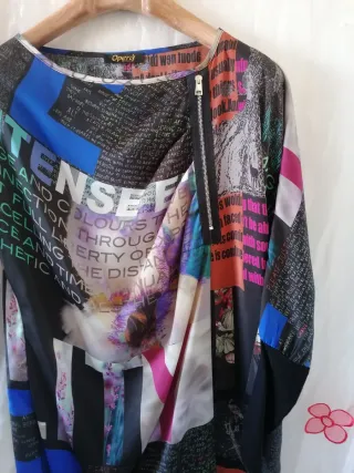 Abito tunica da donna dal design unico e ricercato, con una stampa vivace che unisce motivi floreali e carta di giornale francese. Linea morbida e confortevole, ideale come abito mezza stagione. Dettagli principali: *Stampa originale: carta di giornale francese + floreale *Scollo asimmetrico con zip decorativa fissa *Zip laterale funzionale *Maniche lunghe leggermente ad ala, con avambraccio in doppia maglina nera elasticizzata *Polsini neri a contrasto *Taglio morbido, elegante e diritta Tessuto misto viscosa e poliestere *Poliestere e viscosa Brand: Opéra Fashion Taglia 42 ita #abitonuovo #donna42 #lover #floreale #sera