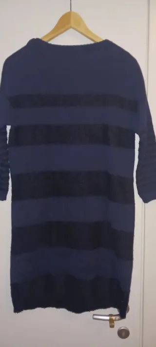 Abito da donna a righe blu scuro e blu. - Girocollo. - Maniche lunghe. - Tessuto a maglia.