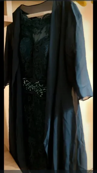 Elegante abito da sera con spalline sottili. La parte superiore ha un effetto pizzo, mentre la gonna è ampia e leggermente trasparente. Corpino con maniche corte e finti bottoncini abbinato. Abbinabile a stola nera che vendo separatamente.