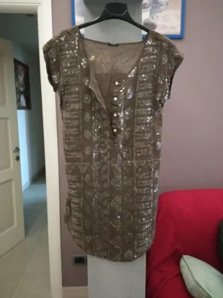 Abito da donna con una fantasia di paillettes scintillanti. - Maniche corte. - Scollo a V. - Chiusura con bottoncini.