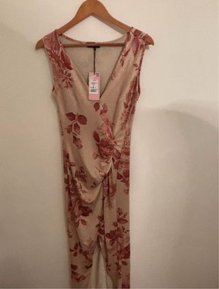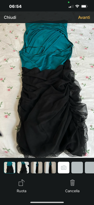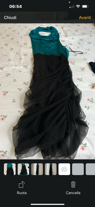 Articolo in poliestere, vestito foderato, il colore reale dei fiori è salmone, scollatura profonda, chiusura con cerniera posteriore, ottime condizioni, taglia S valutare bene le misure che sono: ascella-ascella cm. 38 lunghezza cm. 90