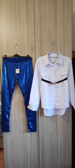 Completo da donna perfetto per le feste. - Pantalone blu scintillante con paillettes. - Camicia bianca con taschini sul petto e cintura nera con dettagli dorati.
