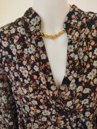 Elegante abito da donna con una vivace fantasia floreale su sfondo nero. Perfetto per diverse occasioni. - Scollo a V con - Maniche lunghe. - Tessuto leggero e fluido. - Balza sulla gonna - Foderato