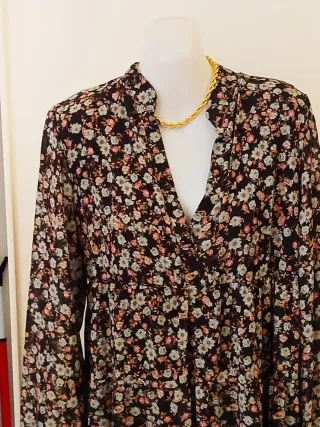 Taglia S ITA 40-42, EU 36-38 (veste largo), nuovo, con cartellino. Poliestere 100%, mezza lunghezza, fantasia paisley predominanza blu/verde, maniche lunghe, colletto con chiusura a bottoncini sul retro, vita elasticizzata. fodera interna. Per tutte le stagioni ed ogni occasione.