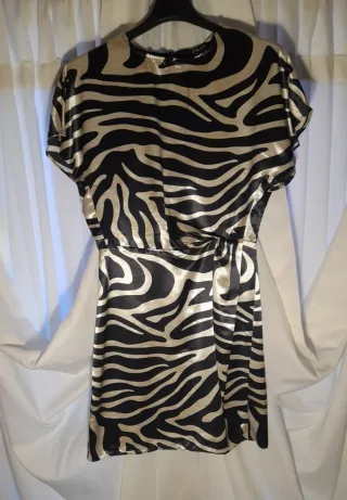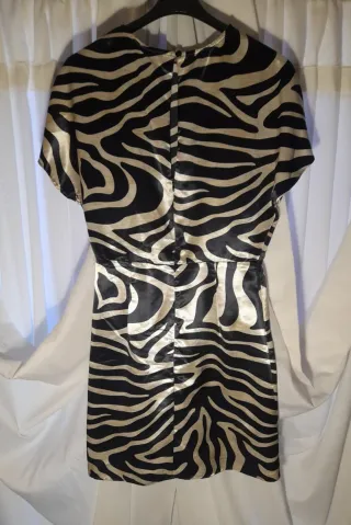 Vestito estivo da donna con fantasia zebrata. - Fantasia zebrata nero e panna. - Taglio corto. - Maniche corte. - Cintura annodata in vita. - Semichiuso dietro con lampo a metà. Spalle da bordo manica 65 cm Torace 44 cm Vita 34 cm Lunghezza davanti 82 cm Bacino 43 cm Larghezza bordo basso 51 cm