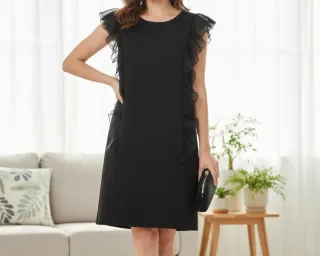 Elegante abito da donna con dettagli in pizzo sulle tasche e maniche a volant. - Maniche corte a volant. - Dettagli in pizzo sulle tasche. - Scollo rotondo.