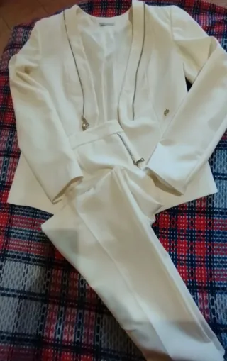 Elegante completo da donna. - Giacca con dettagli zip e ciondolo. - Pantaloni coordinati con zip.
