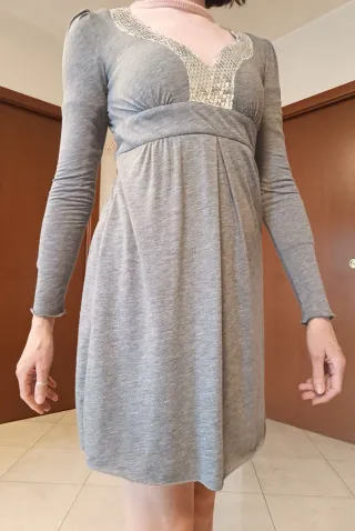 Abito longuette donna, colore grigio, tg M, cotone e polyestere, manica lunga, adatto mezza stagione, scollo a "V" con ricamo di paillettes in tinta, lampo a scomparsa sul fianco sx, sottogonna incorporato con stesso tessuto. 15€