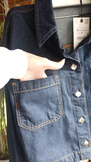 Vestito lungo in denim di Zara. Design a camicia con bottoni. - Colletto a camicia. - Manica a sbuffo. - Due tasche sul petto. - Apertura frontale.