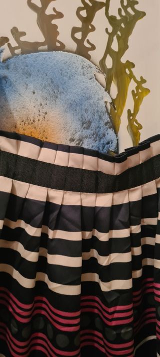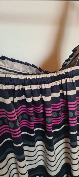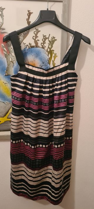 Delizioso abito corto a spalle scoperte, in cotone leggermente elasticizzato, con una bella fantasia floreale su fondo nero/grigio fumo. Arricciato nella schiena, con tasche interne sui fianchi e cerniera laterale, sfoderato, fresco ed estivo. Sta molto bene indossato. In ottime condizioni, non ha difetti; è stato indossato poche volte e tenuto con la massima cura. Vestibilità: taglia IT 42 (EU 38). Se desiderate sapere le misure, non esitate a contattarmi.