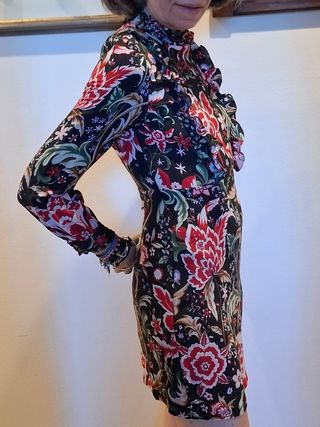 Bellissimo miniabito Zara a fiori multicolor, taglia S (36/8). Perfetto per un look primaverile! - Maniche lunghe - Dettaglio in pizzo sul retro. Lampo invisibile nel fianco. Frappa davanti. Fascietta. Bottone di ricambio. Corto e svasato. Usato una volta - Ottime condizioni. Misure: spalle cm 38. Petto 39. Cintura larga 35. Fondo largo 55. Lungo 88. Vita lunga 38. Manica lunga 56 larga 16