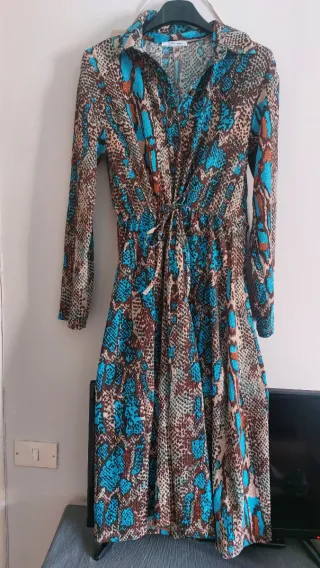 Elegante abito midi Zara con una vivace fantasia animalier. Il modello presenta una chiusura con bottoni sul davanti e una cintura in vita per un fit personalizzabile. - Maniche lunghe. - Collo a camicia. - Tessuto leggero e fluido.