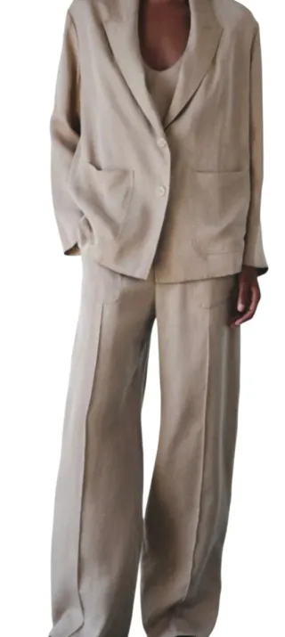 Completo composto da giacca e pantaloni.Nuovo in Lyocell. Entrambi taglia M Pantaloni vita 41 Fianchi 53 Lunghezza dal cavallo 78 Tot lunghezza 111. - Giacca con chiusura a bottone. - Tasche applicate sulla giacca. - Pantaloni a gamba leggermente larga.