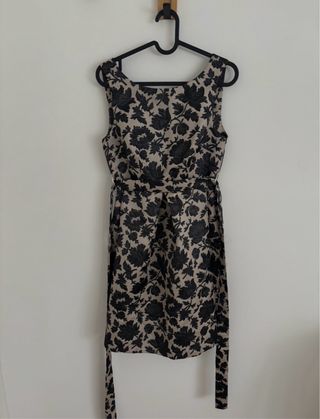 Elegante abito con fantasia floreale. - Scollo rotondo. - Senza maniche. - Cintura in vita. - Lunghezza al ginocchio. -Marca Lanacaprina tessuto ottimo -Perfetto per cerimonie