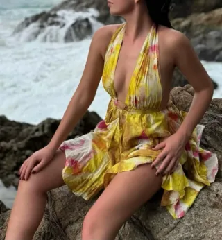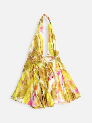 Vestito corto con fantasia tie-dye. Scollo a V profondo e spalline sottili. - Fantasia tie-dye con sfumature di giallo e rosa. - Tessuto leggero e svolazzante.