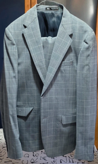Elegante giacca da uomo Zara, perfetta per completare un look formale o casual. - Colore grigio versatile. - Design classico con un bottone. - Tasche frontali applicate.