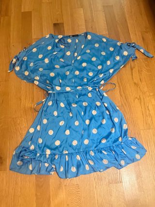Bellissimo vestito estivo Zara a pois bianchi su sfondo blu. - Modello corto con gonna a balze. - Maniche a sbuffo con laccetti. - Chiusura con cintura in vita.