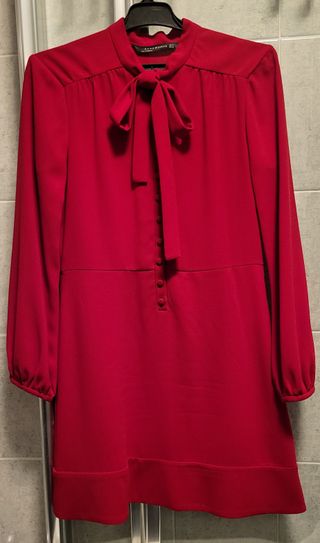 Abito mini originale Zara Woman come in foto, molto carino, rosso burgundy, chiuso davanti con bottoncini foderati e con fiocco, maniche lunghe a sbuffo che terminano con bottoncino, chiusura laterale con zip, gonna leggermente svasata, in perfette condizioni, usato un paio di volte, taglia S. Composizione: 100% poliestere. Misure: lunghezza cm. 80; larghezza fianchi cm. 88, larghezza da spalla a spalla cm. 37, girovita cm. 74, lunghezza manica cm. 55