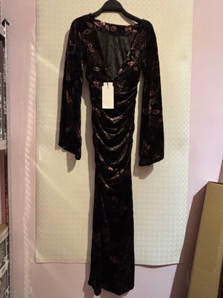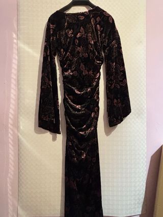 Elegante vestito lungo in velluto con stampa floreale. Presenta un design drappeggiato sul davanti che valorizza la silhouette. - Maniche lunghe a campana. - Tessuto morbido e lucido. - Lunghezza fino alle caviglie.