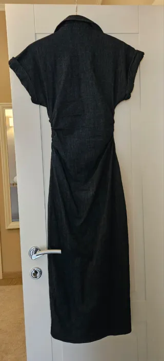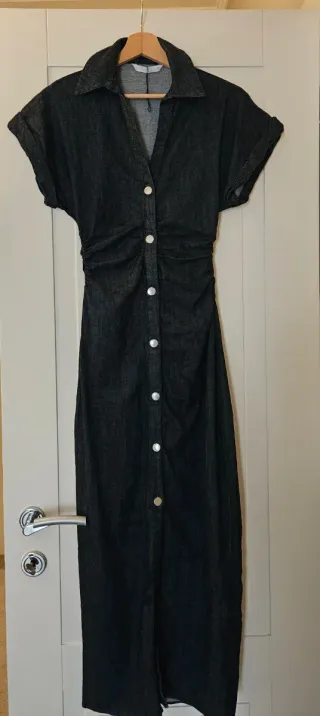 Bellissimo vestitino lungo in cotone denim jeans elasticizzato scuro, con bottoncini dorati davanti, spacco anteriore, zip di chiusura laterale, drappeggi sui fianchi e maniche corte con risvolto. Capo versatile e ricercato, molto chic indossato e adatto ad ogni outfit e occasione. Veste una Xs e una S. Brand Zara.