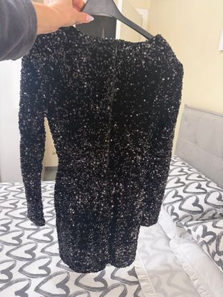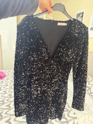 Elegante vestito corto con maniche lunghe, interamente ricoperto di paillettes scintillanti. - Tessuto con paillettes. - Maniche lunghe. - Scollo rotondo.
