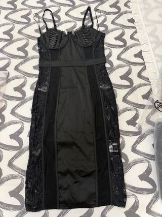 Bellissimo vestito estivo, ideale per occasioni speciali. - Modello aderente, lunghezza midi. - Dettagli in pizzo nero sul corpetto e in vita. - Scollo a halter con spalline sottili.