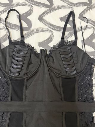 Elegante vestito con dettagli in pizzo. - Tessuto in raso. - Inserti in pizzo. - Laccetti sul corpetto.