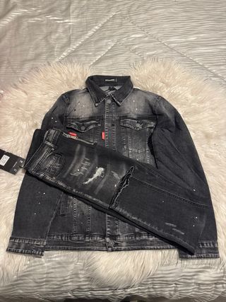 Completo composto da giacca e jeans. - Giacca in denim con dettagli a schizzi. - Jeans in denim con strappi e schizzi. - Chiusura con bottoni sulla giacca. - Tasche frontali sulla giacca.
