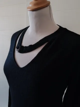 Elegante abito Twin-set con collo alto morbido. - Tessuto morbido e confortevole. - Dettaglio con fiocco e strass sul fondo. - Maniche lunghe. Taglia scritta L ma direi meglio per una M