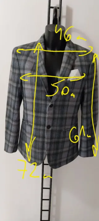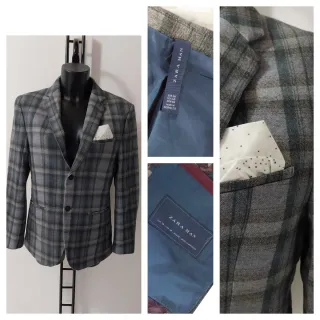 Elegante blazer Zara Uomo con un motivo a quadri. Realizzato in Marocco. - Motivo a quadri grigio e multicolore. - Fodera interna blu. - Taschino sul petto con fazzoletto.