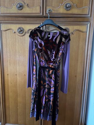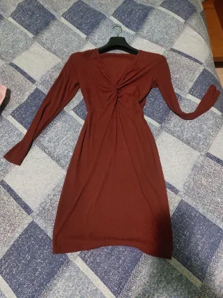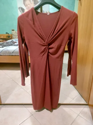 Elegante abito da donna indossato due volte, con una particolare torsione sul davanti, il colore esatto si vede bene nella prima foto. - Maniche lunghe. - Scollo a V. - Non troppo aderente.