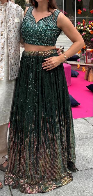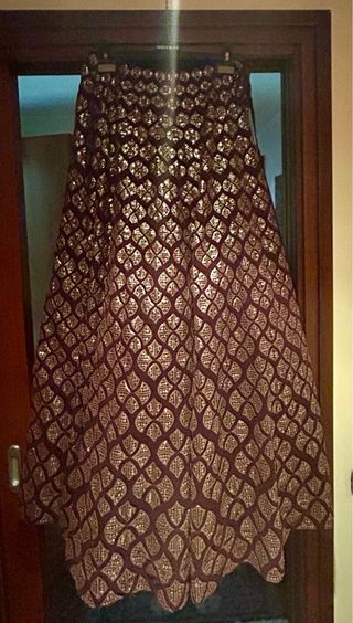 Completo tradizionale indiano per cerimonie. - Tessuto con motivi dorati. - Gonna lunga e top coordinato.
