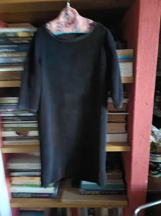 Vestito nero, si può usare anche come camiciona, dietro ha pens in mezzo lunga, spacchetti laterali, le maniche e il collo a v sono colore bianco.