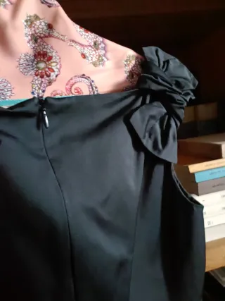 In raso, tagliato in vita con cintura stesso tessuto, leggermente svasato, fiocchi sulle spalle, foderato, collo stondato, (la firma è stata tagliata). Cerniera dietro. Mai indossato x cambio taglia