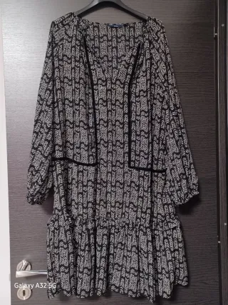Vestito lungho ampio nero e bianco fantasia geometrica, collo a v, polsini elasticizzati, rifiniture davanti di velluto, balze verso la fine del vestito.