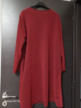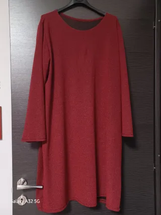 Vestito lungo ampio rosso luccicante, tessuto coprente, collo a girocollo. Adatto per eventi.
